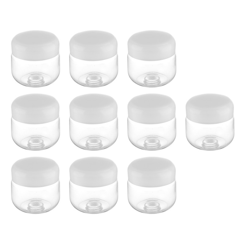 ظرفیت 65 سی سی همراه با درب پیچدار مناسب برای نگهداری کرم و ژل های بهداشتی و سایر مصارف مانند نگهداری دکمه ، سنجاق ، میخ ، پیچ و ... ابعاد : ارتفاع حدود 6 سانتیمتر و قطر حدود 5 سانتیمتر میباشد ، این کالا در بسته بندی 10 عددی ارائه میشود.