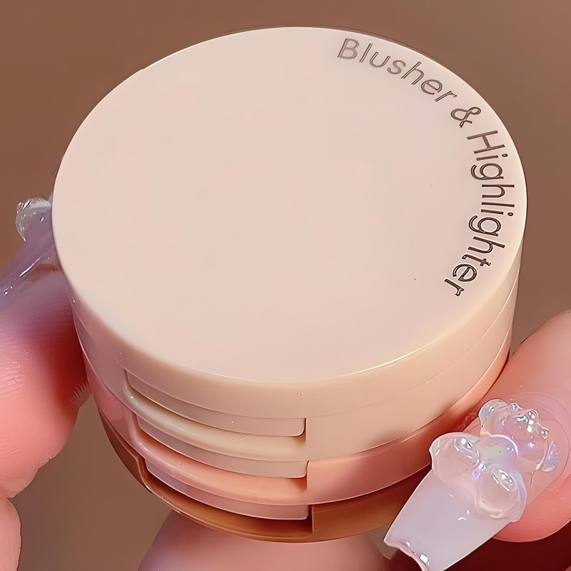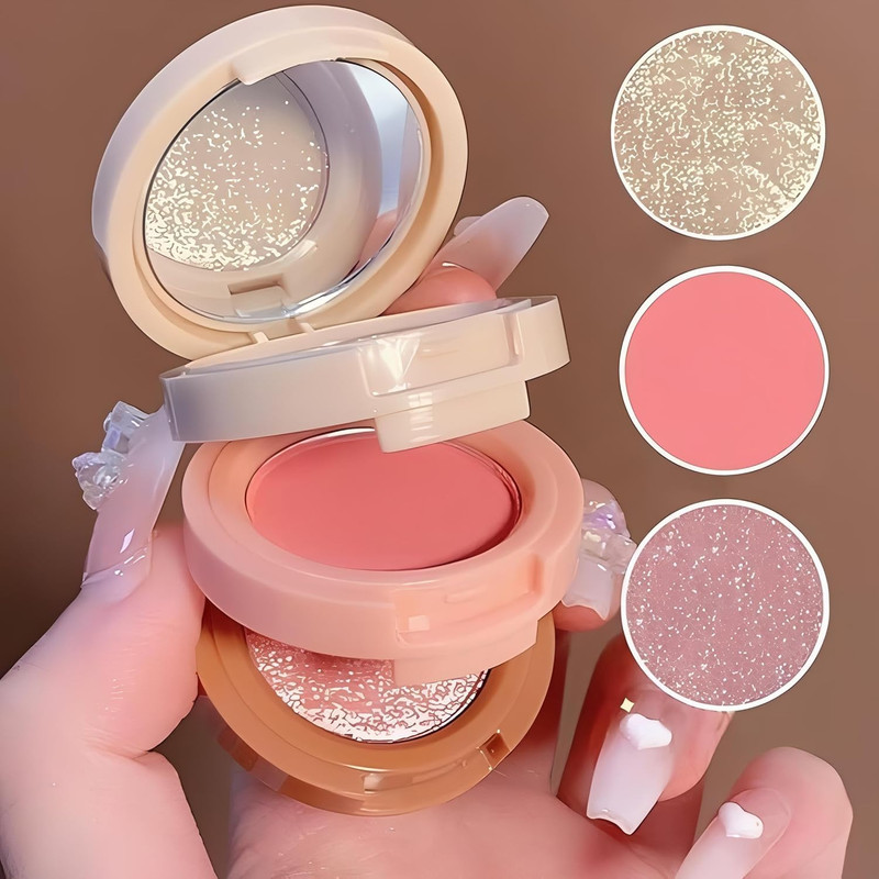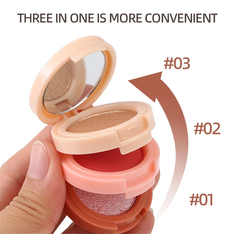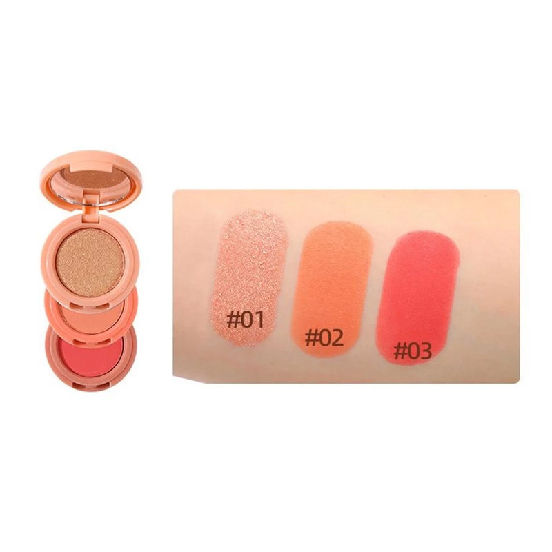 سه در یک شامل هایلایتر براق برای درخشان کردن گونهها، بینی و استخوان ابرو میباشد. رژگونه مات با رنگ گرم و طبیعی سایه چشم شایندار یا هایلایتر دوم با رنگ رزگلد میباشد.