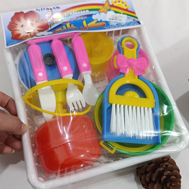 مخصوص دختر خانم ها جهت خاله بازی دارای جارو و خاک انداز اسباب بازی همچنین قابلمه و چنگال های آشپز خانه به همراه سبد و گاز پیک نیکی زیبا