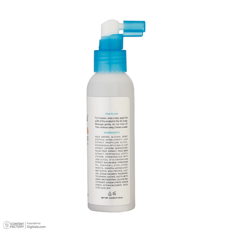 راهنمای استفاده: به مدت 6 هفته، روزى یکبار مقدار پنج پاف از محصول را بر روى پوست کف سر اسپرى کنید، به آرامى ماساژ دهید. بعد از مصرف 6 هفته، مصرف را به صورت هفته اى 3 روز و روزى یک مرتبه ادامه دهید.