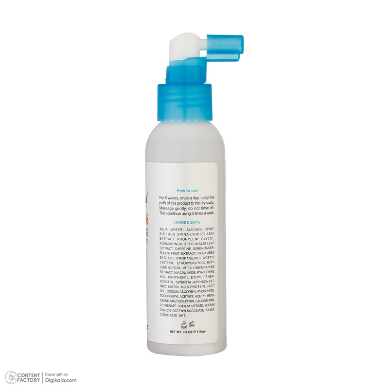 راهنمای استفاده: به مدت 6 هفته، روزى یکبار مقدار پنج پاف از محصول را بر روى پوست کف سر اسپرى کنید، به آرامى ماساژ دهید. بعد از مصرف 6 هفته، مصرف را به صورت هفته اى 3 روز و روزى یک مرتبه ادامه دهید.