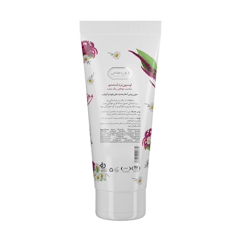ابتدا موهای خود را با شامپو شستشو دهید و به خوبی آبکشی کنید. مقداری از لوسیون نرم کننده را بر روی موهای نمدار (پس از شستشو) بمالید. معمولاً یک مقدار مناسب بین 10 تا 20 میلیلیتر کافی است، اما بسته به طول و حجم موهای شما ممکن است این مقدار تغییر کند.