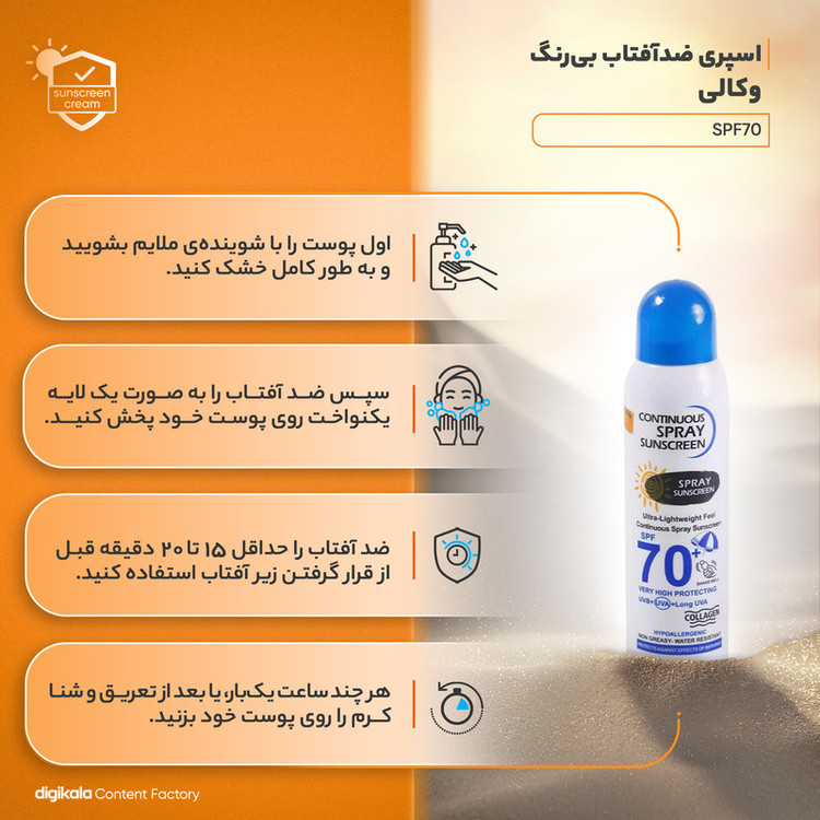 اسپری ضدآفتاب بی‌رنگ وکالی مدل SPF70 مناسب انواع پوست، حجم 230 میلی‌لیتر