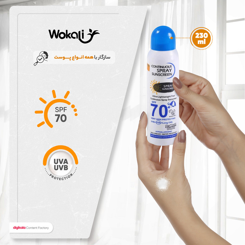اسپری ضدآفتاب بی‌رنگ وکالی مدل SPF70 مناسب انواع پوست، حجم 230 میلی‌لیتر
