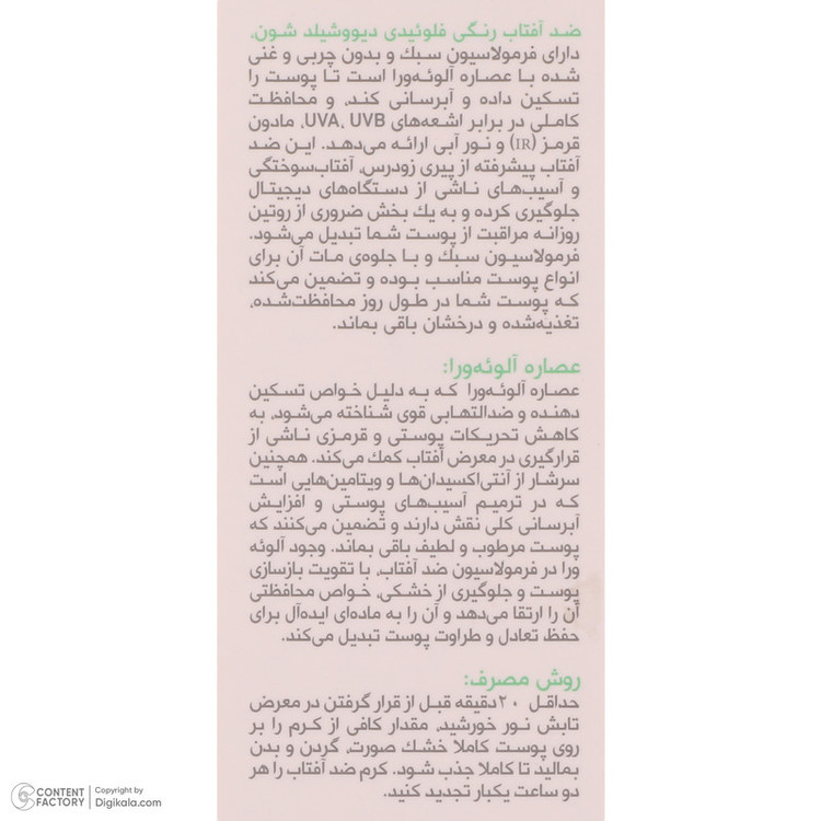 حداقل ۲۰دقیقه قبل از قرار گرفتن در معرض تابش نور خورشید، مقدار کافی از کرم را بر روی پوست کاملا خشک صورت، گردن و بدن بمالید تا کاملا جذب شود. کرم ضد آفتاب را هر دو ساعت یکبار تجدید کنید.