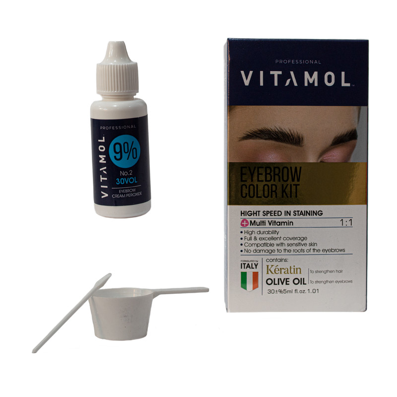 ابرو یکی از مهمترین اجزای صورت است که نقش انکار ناپذیری در جذابیت چهره و چشم های شما دارد. رنگ ابرو باید متناسب با رنگ مو، پوست و گاها رنگ چشم انتخاب شود. کیت رنگ ابرو ویتامول در رنگ های متنوع و زیبا عرضه شده است و می تواند نیاز تمامی افراد با سلایق مختلف را برآورده کند. دقت داشته باشید که ابروها به دلیل ساختار ضعیف تری که دارند، سریعتر از موها رنگ می گیرند و بهتر است از اکسیدان ضعیف تری برای آنها استفاده نماییم، در کیت رنگ ابرو ویتامول نیز یک اکسیدان مخصوص ابرو قرار دارد. کیت رنگ ابرو ویتامول، با فرمولاسیون ایتالیایی خود برای رنگ کردن ابروها طراحی شده و قدرت مرطوب کنندگی و براق کنندگی بالایی دارد. این محصول حاوی کراتین و روغن زیتون بوده و با تأمین ویتامین های مورد نیاز تار موهای ابرو، باعث نرمی، لطافت و زیبایی آنها خواهد شد. کیت رنگ ابرو ویتامول شامل یک رنگ ابرو در حجم 30 میلی لیتر، یک اکسیدان مخصوص ابرو در حجم 30 میلی لیتر و کاسه مخصوص است که با استفاده از آن می توانید به آسانی ابروهایتان را به رنگ دلخواه در بیاورید. تنوع بالای رنگی کیت رنگ ابرو ویتامول، از دیگر ویژگی های مثبت آن است که باعث شده برای همه افراد قابل استفاده باشد.