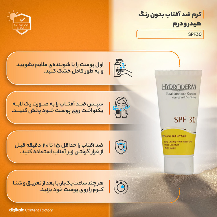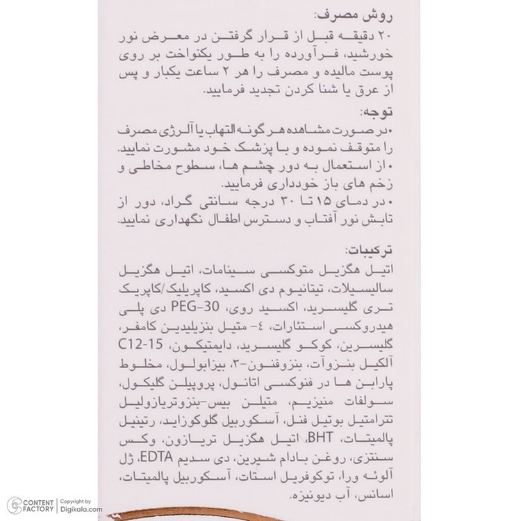 نيم ساعت قبل از خارج شدن از منزل و يا محل کار به مقدار کافی از فرآورده را بر روي نقاطي از پوست که در معرض تابش نور خورشيد قرار دارند ماليده و به خوبی ماساژ دهيد. اين عمل را هر دو ساعت يکبار تجديد کنيد.