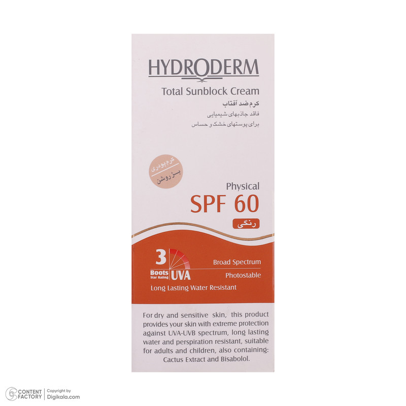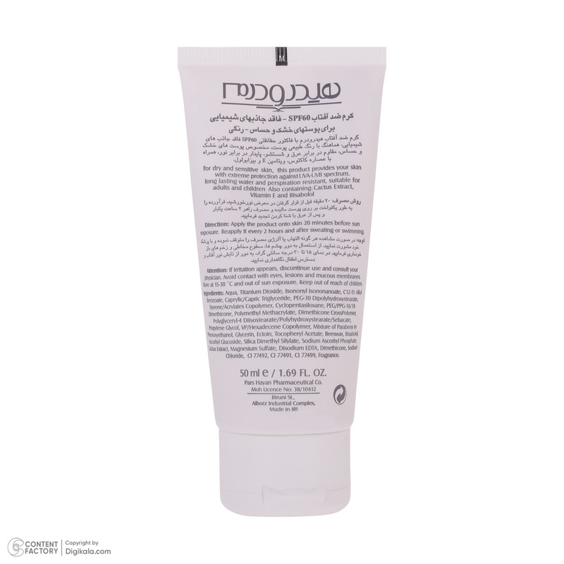 راهنمای استفاده : نيم ساعت قبل از خارج شدن از منزل و يا محل كار به مقدار كافی از كرم ضد آفتاب با فاكتور حفاظتی 60 هيدرودرم بر روی نقاطی از پوست كه در معرض تابش نور خورشيد قرار دارند ماليده و به خوبی ماساژ دهيد اين عمل را هر دو ساعت يكبار تجديد كنيد