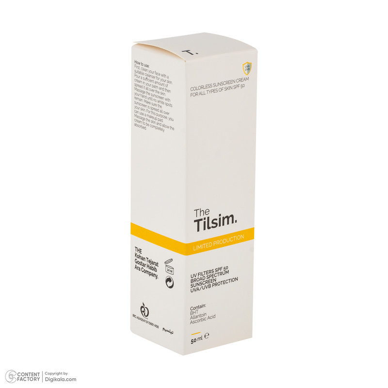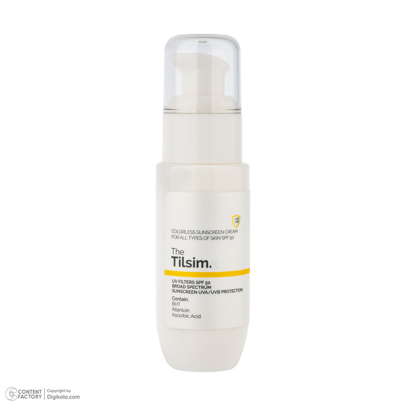 کرم ضد آفتاب بی‌رنگ تیلسیم SPF 50 مدل Daily ‌محافظ UVA،UBA مناسب برای انواع پوست حجم 50 میلی لیتر