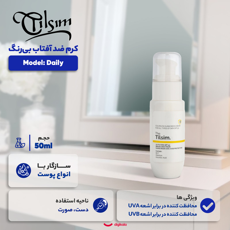 کرم ضد آفتاب بی‌رنگ تیلسیم SPF 50 مدل Daily ‌محافظ UVA،UBA مناسب برای انواع پوست حجم 50 میلی لیتر