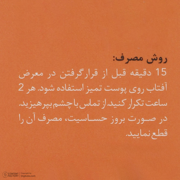 راهنمای استفاده : 20 دقیقه پیش از قرار گرفتن دربرابر اشعههای خورشید، مقدار کافی (2 بند انگشت) از کرم را روی پوست صورت به صورت دورانی پخش کنید. برای تاثیرگذاری بیشتر بهتر باید هر 2 ساعت یکبار یا بعد از تعریق، شنا و ورزش کرم ضد آفتاب خود را تمدید کنید.