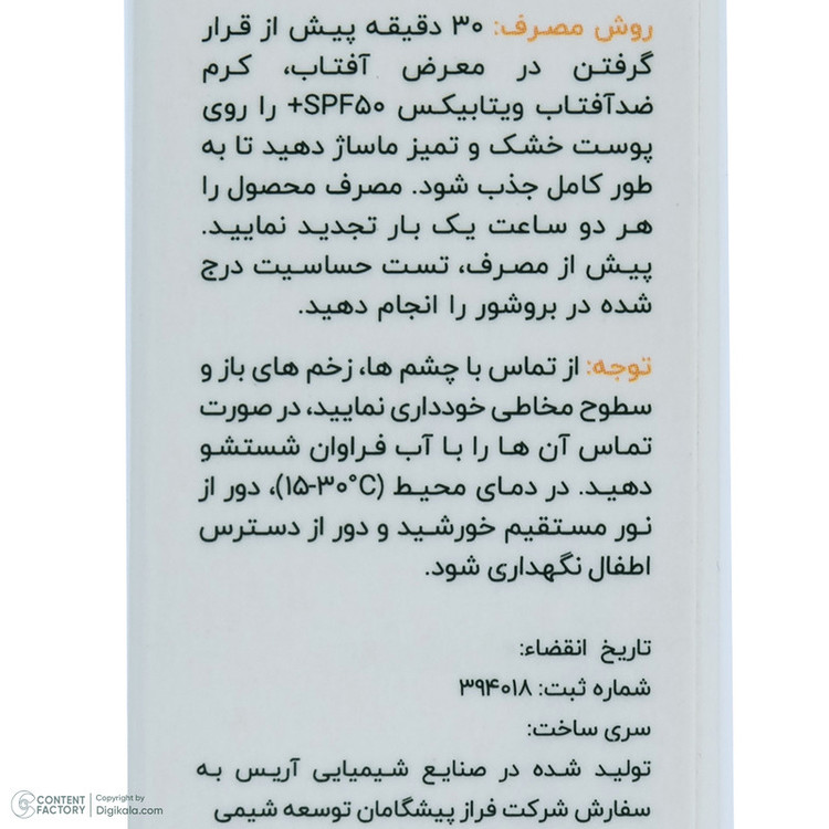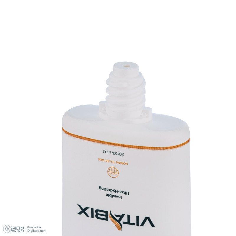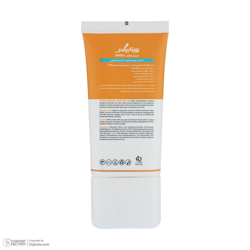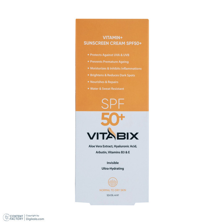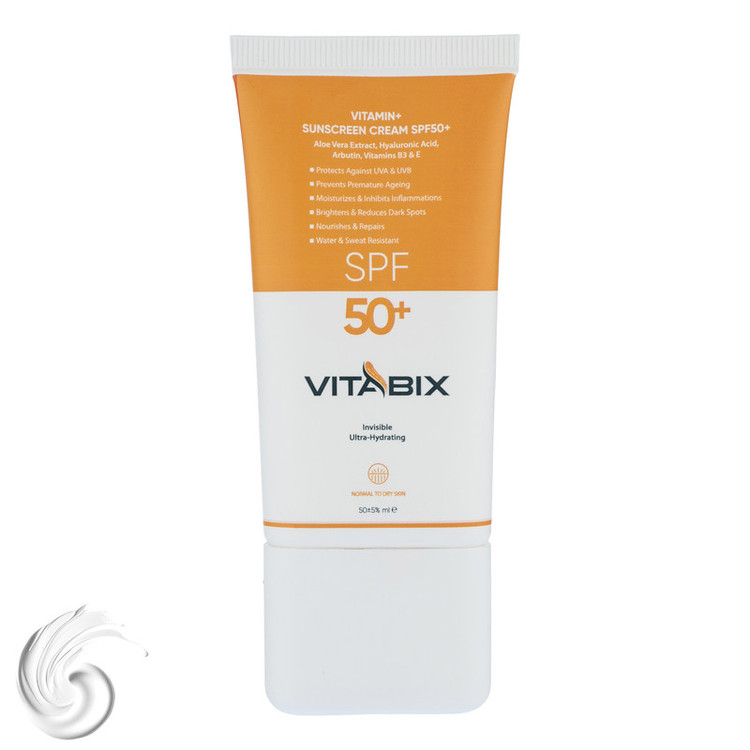 کرم ضد آفتاب بدون رنگ ویتابیکس SPF 50 مدل +Vitamin ‌مناسب پوست‌ خشک حجم 50 میلی‌لیتر محافظت‌کننده اشعه UVA و UVB، بدون تست حیوانی، با ماندگاری 2 ساعته
