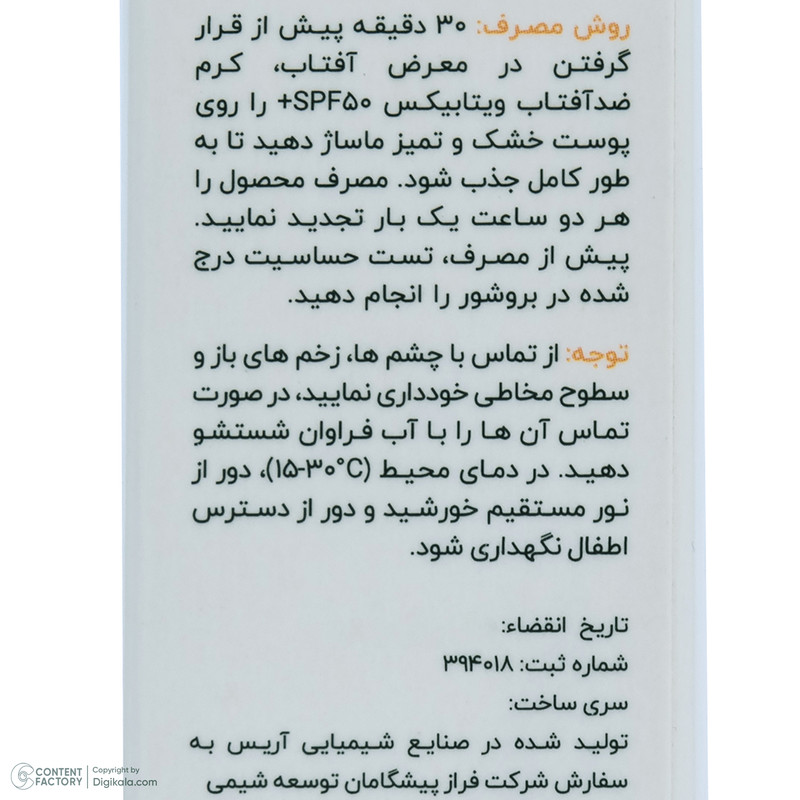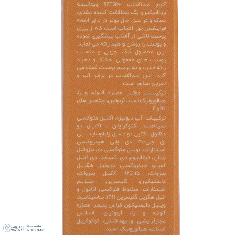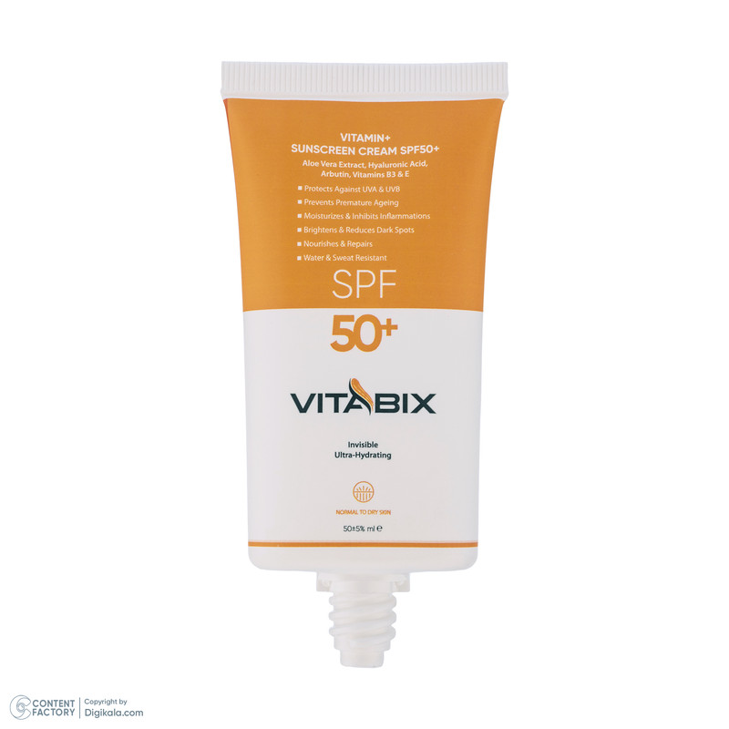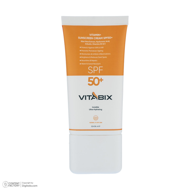 کرم ضد آفتاب بدون رنگ ویتابیکس SPF 50 مدل +Vitamin ‌مناسب پوست‌ خشک حجم 50 میلی‌لیتر محافظت‌کننده اشعه UVA و UVB، بدون تست حیوانی، با ماندگاری 2 ساعته