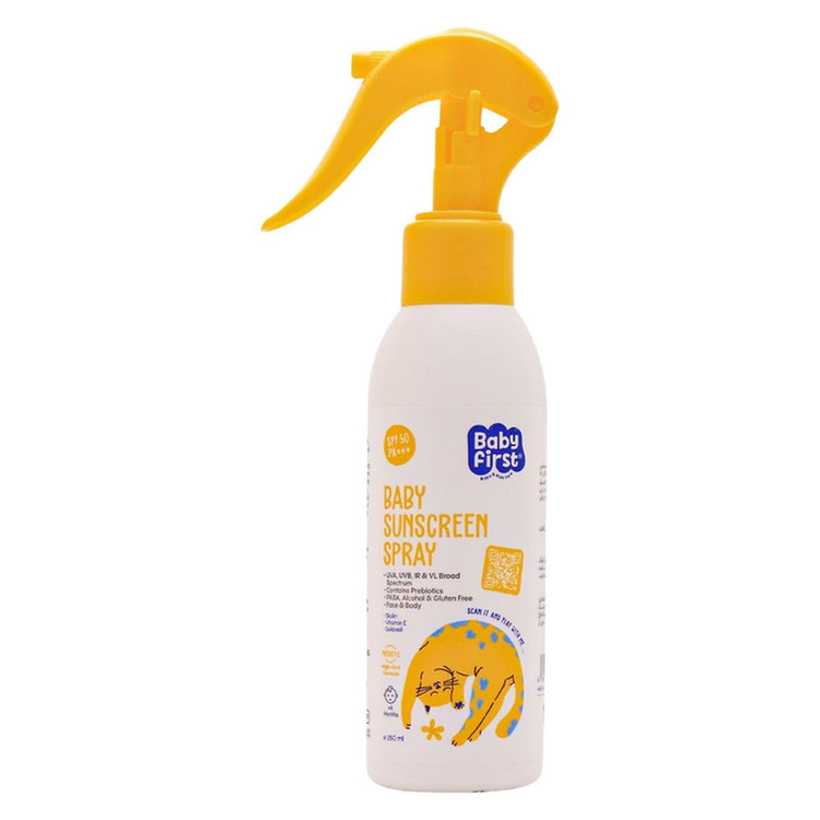 اسپری ضد آفتاب بدون رنگ بیبی فرست SPF 50 مدل پری بیوتیک مناسب انواع پوست حجم 150 میلی‌لیتر