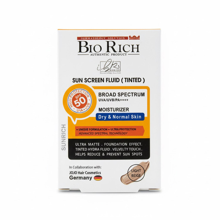 فلوئید ضد آفتاب رنگی صورت بایوریچ SPF 50 مدل BROAD SPECTRUM محافظ UVA ،UVB و PA+++ مناسب برای پوست‌ خشک و معمولی حجم 50 میلی‌لیتر