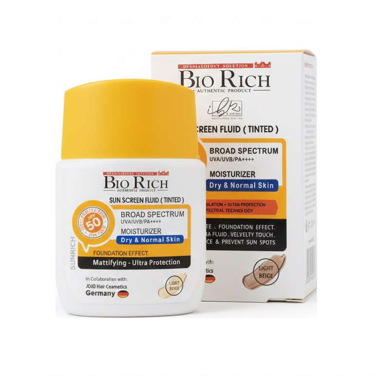 فلوئید ضد آفتاب رنگی صورت بایوریچ SPF 50 مدل BROAD SPECTRUM محافظ UVA ،UVB و PA+++ مناسب برای پوست‌ خشک و معمولی حجم 50 میلی‌لیتر