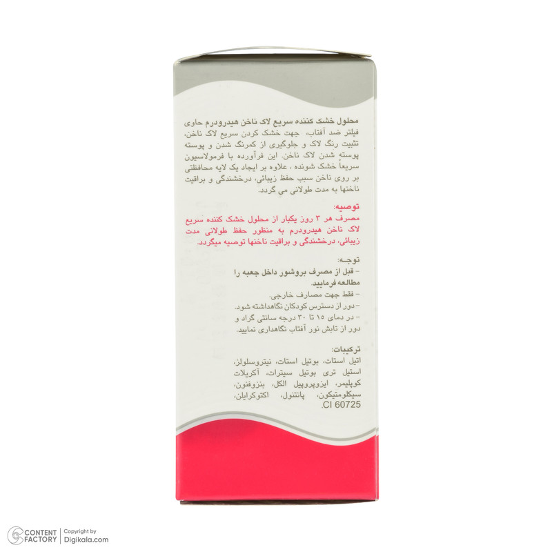 - حاوی فیلتر ضد آفتاب - خشک کننده سریع لاک ناخن - تثبیت کننده رنگ لاک - جلوگیری از کمرنگ شدن و پوسته پوسته شدن لاک ناخن - افزایش مقاومت و ماندگاری لاک ناخن